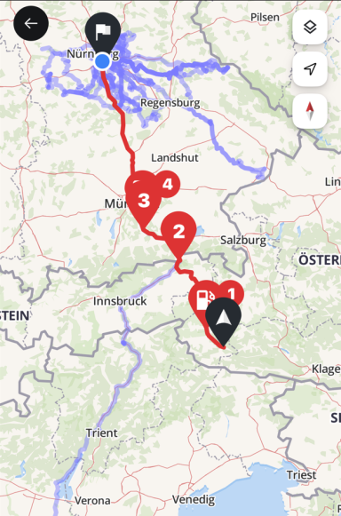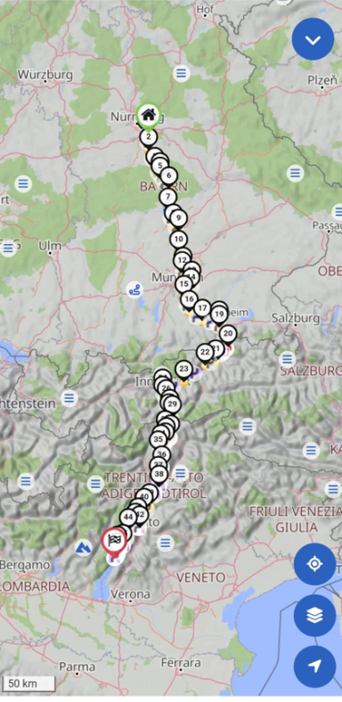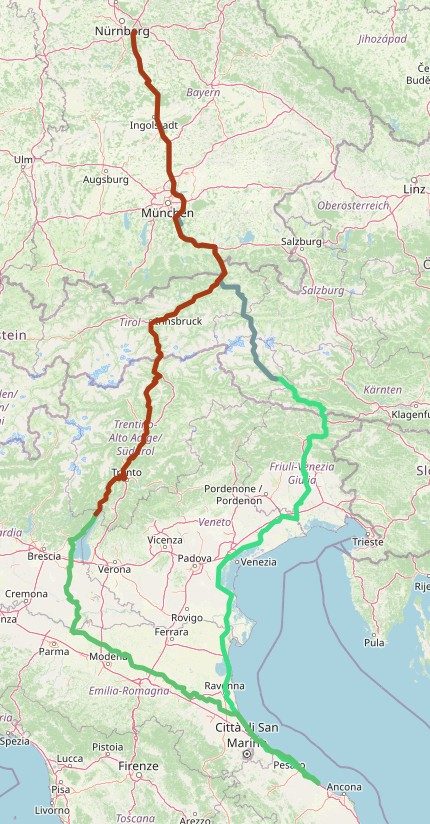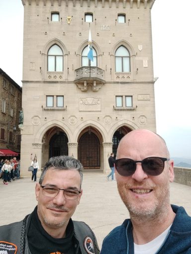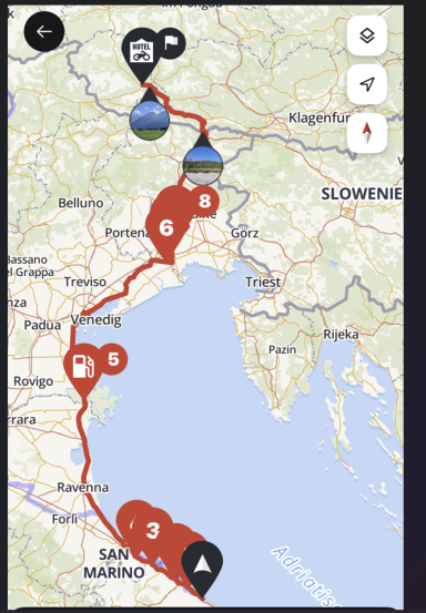 Von Deutschland ging es über Österreich bis zum Brennerpass, dann weiter auf der alten Brennerstraße nach Limone am Gardasee zur ersten Übernachtung. Am nächsten Tag führte die Route über Brescello (Drehort der Don-Camillo-und-Peppone-Filme) und die Panoramica di Pesaro nach Senigallia – unserem Ausgangspunkt für drei Tage. Dort besuchten wir San Marino, entspannten am Strand und erkundeten die Stadt. Anschließend ging es in Richtung Venedig und über den Nassfeldpass nach Lienz zur letzten Etappe, bevor die Rückreise nach Hause anstand.