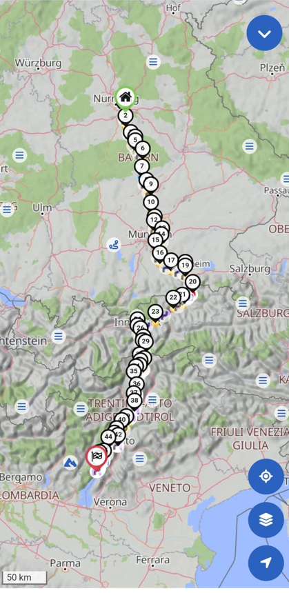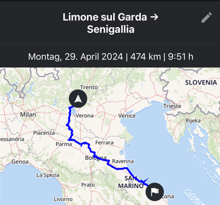 Von Deutschland ging es über Österreich bis zum Brennerpass, dann weiter auf der alten Brennerstraße nach Limone am Gardasee zur ersten Übernachtung. Am nächsten Tag führte die Route über Brescello (Drehort der Don-Camillo-und-Peppone-Filme) und die Panoramica di Pesaro nach Senigallia – unserem Ausgangspunkt für drei Tage. Dort besuchten wir San Marino, entspannten am Strand und erkundeten die Stadt. Anschließend ging es in Richtung Venedig und über den Nassfeldpass nach Lienz zur letzten Etappe, bevor die Rückreise nach Hause anstand.